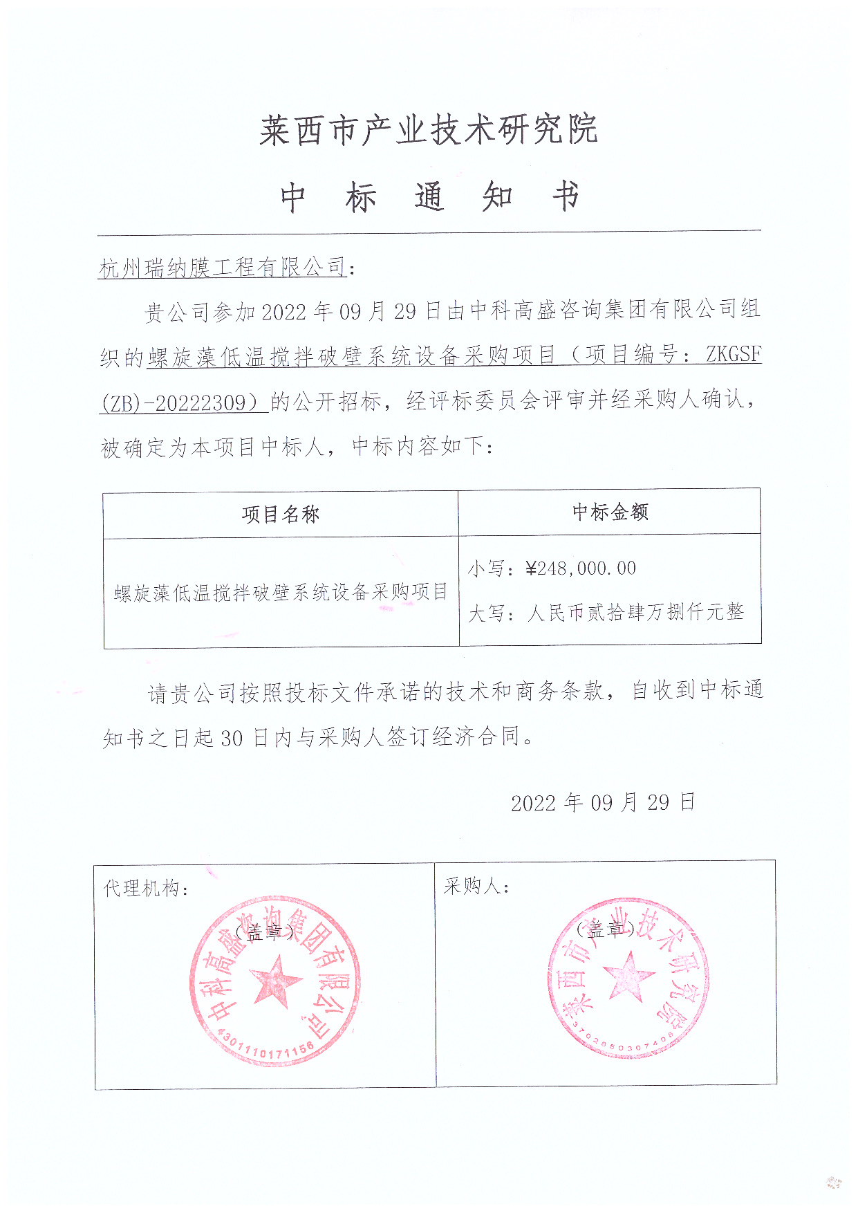 莱西市产业技术研究院螺旋藻低温搅拌破壁系统项目中标通知书