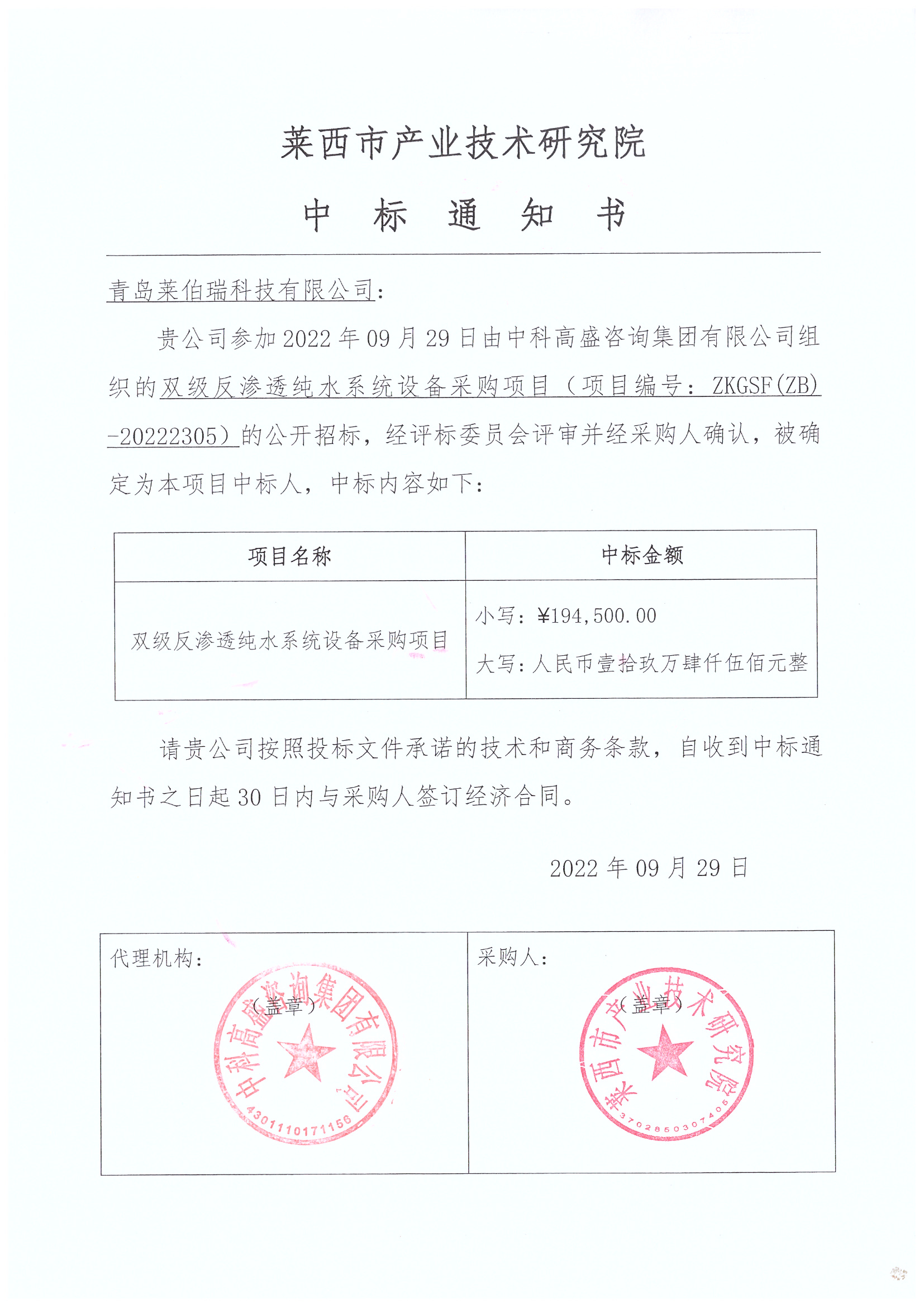 莱西市产业技术研究院双级反渗透纯水系统项目中标通知书