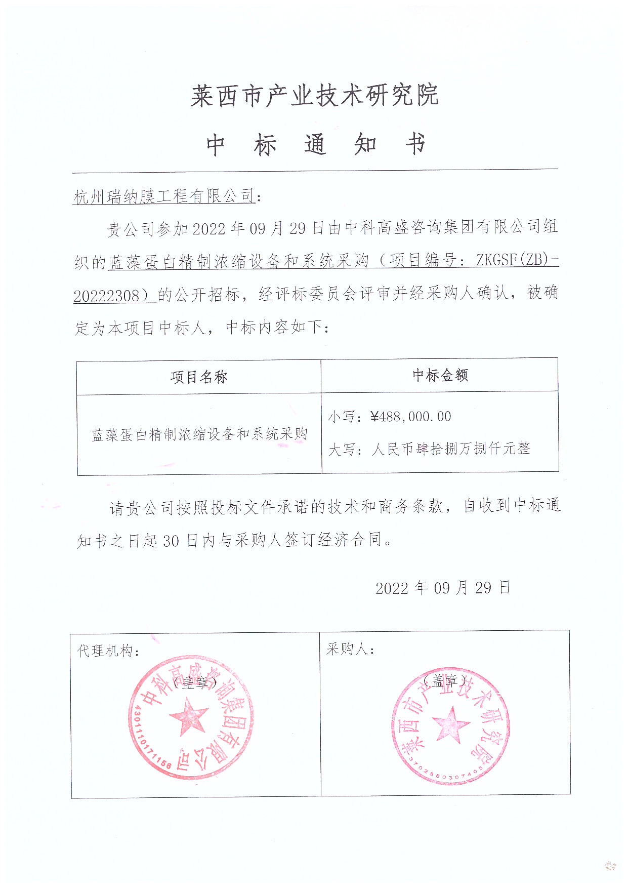 莱西市产业技术研究院蓝藻蛋白精制浓缩设备和系统项目中标通知书